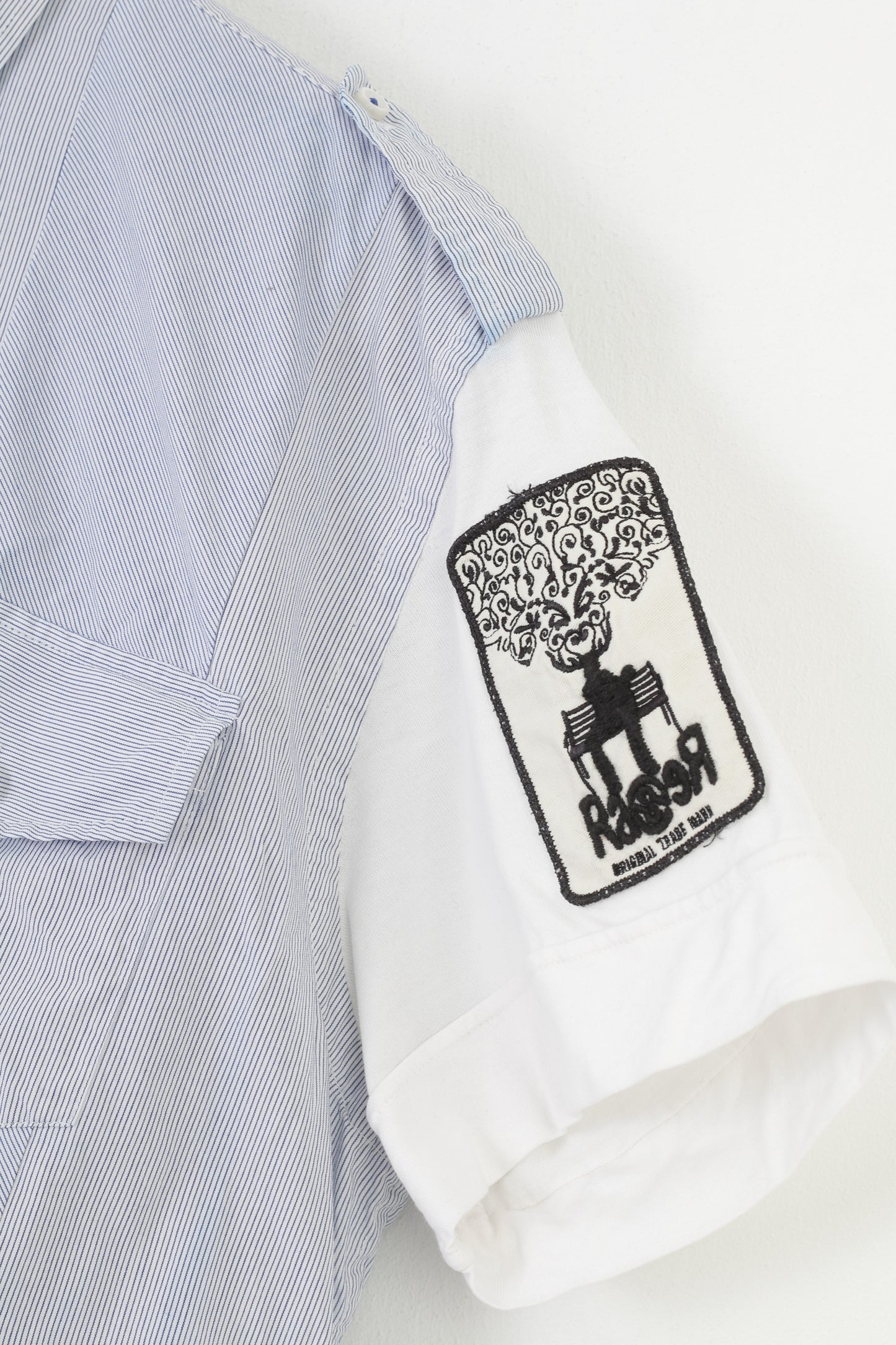 Rare hommes XXXL L chemise décontractée rayé bleu manches courtes col en coton boutons patchs style en italie haut