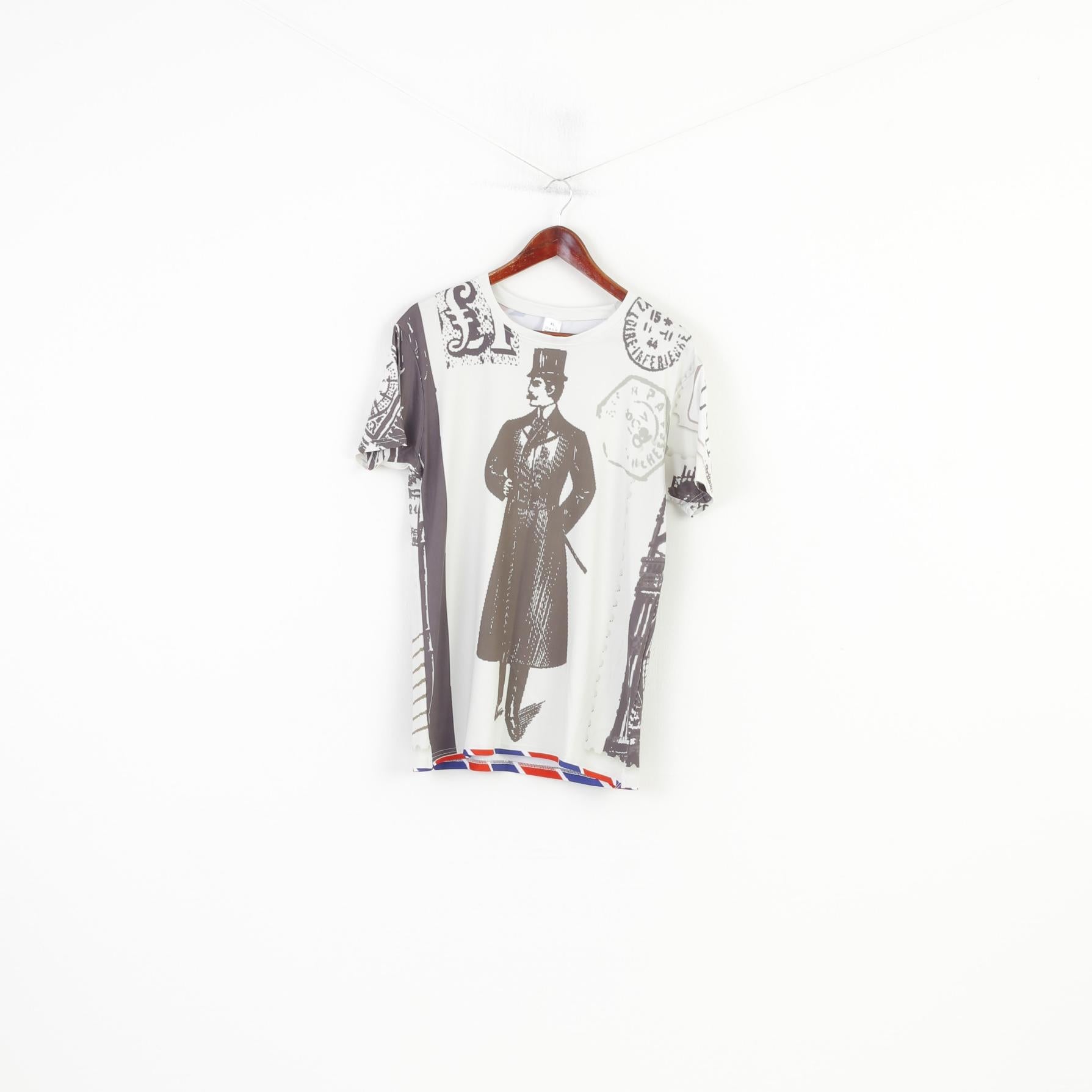 Camicia vintage da uomo XL in jersey elasticizzato beige con grafica London Stamp, vestibilità vintage in Inghilterra